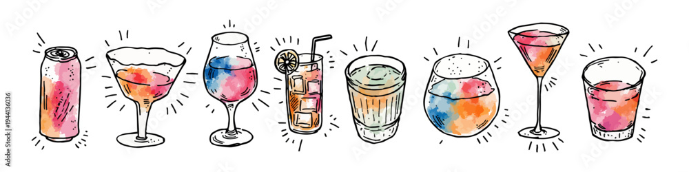 Hand Draw Sketch Cocktail Glasses Set. Wine Doodle Art. Sketch Vector Illustration of Wine Glasses Icons in Minimalist Style. Line Art Party Illustration for Social Media, Menu, Party, Invitation #1944136036