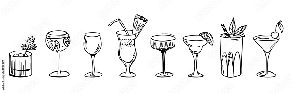 Hand drawn cocktail glasses set in black and white line art #1445119897
