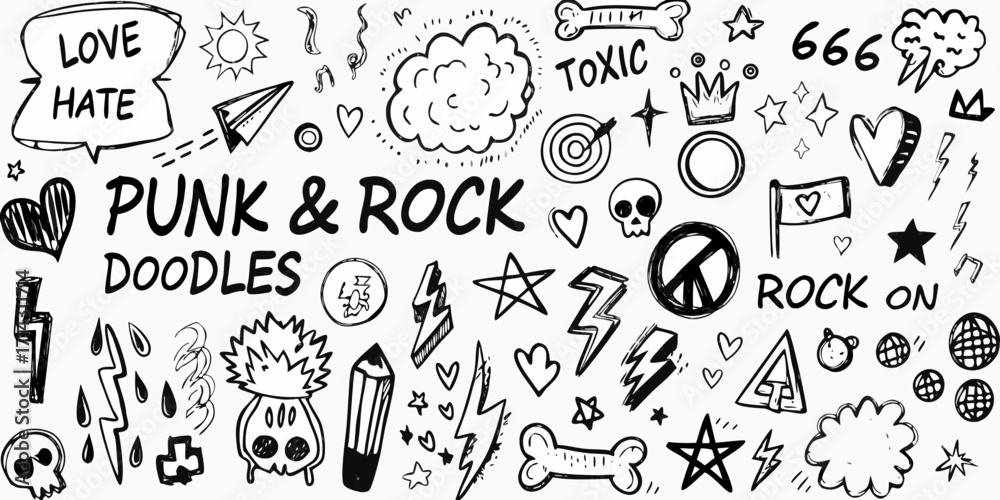Hand drawn punk rock doodles and symbols collection with text elements #1714311714