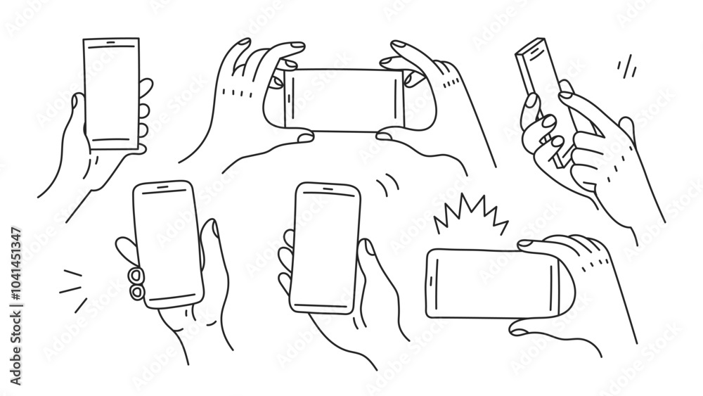 Hand Holding Smartphone Line Set. Outline Finger Gesture with Cellphone collection. Doodle positions using Mobile Phone. Vector illustration #1041451347