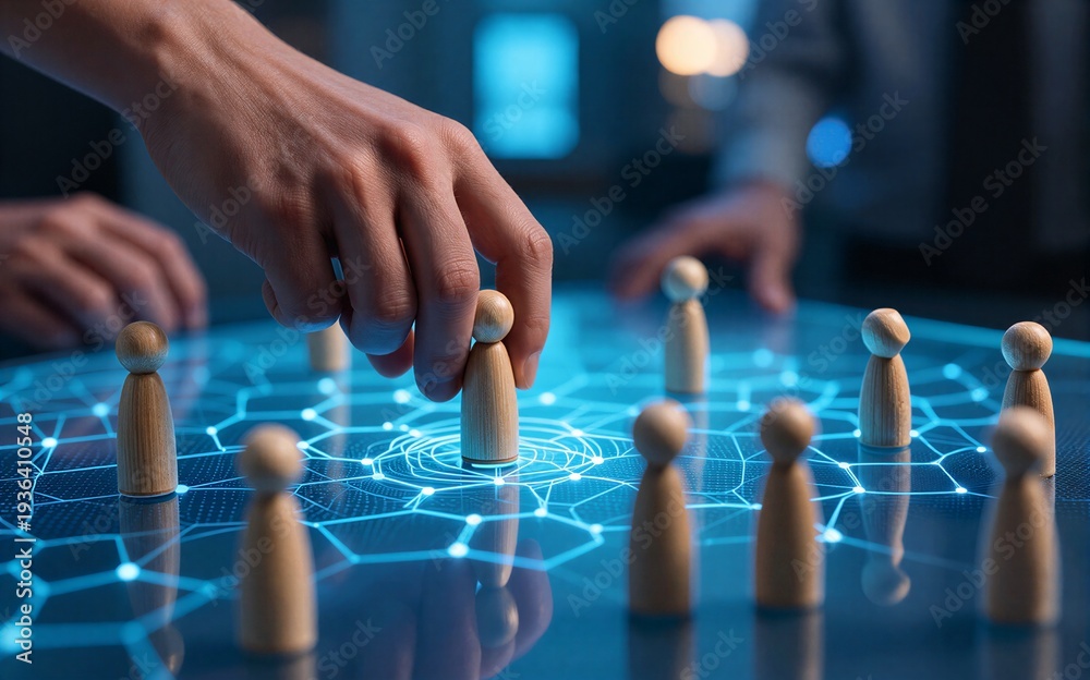 Hand places wooden figures on glowing digital network symbolizing #1936410548