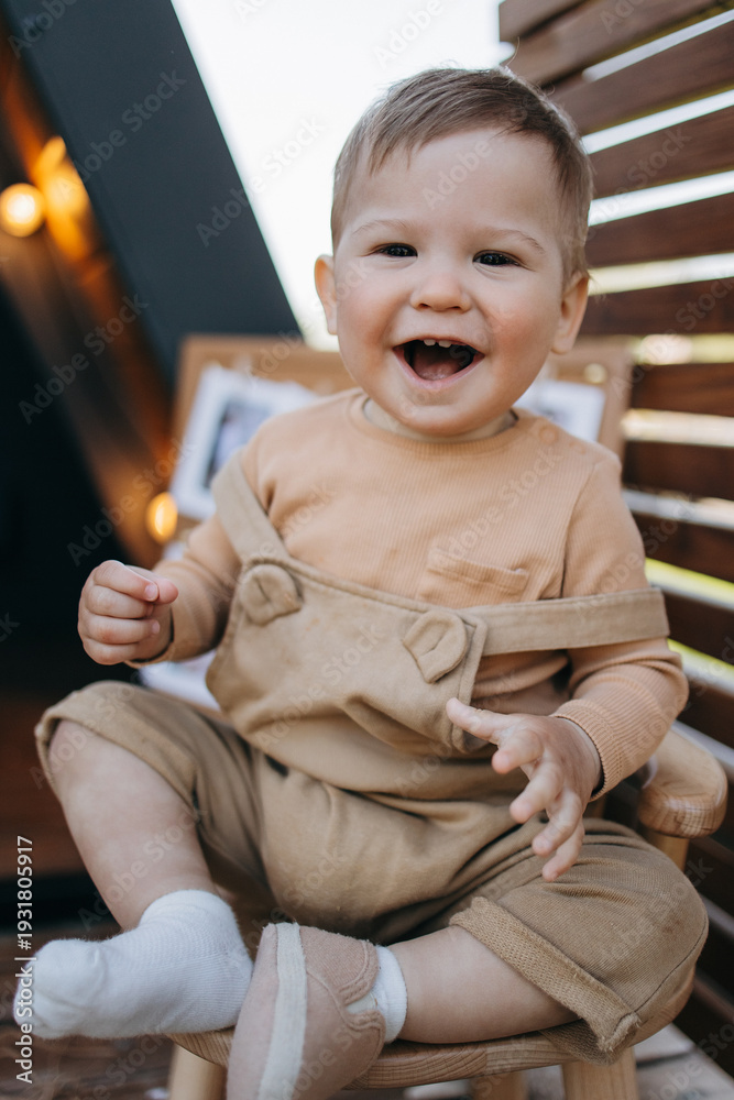 Happy baby boy laughs brightly while sitting on wooden chair outdoors on sunny day wearing cozy brown outfit #1931805917