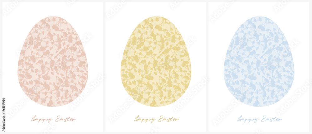 Happy Easter Vector Cards. Cute Eggs in 3 Diferent Colors Isolated on a White Background. Pink,Blue and Yellow Eggs with and Drawn Floral Ornament Inside. Easter Illustrations for Card. #1965517980