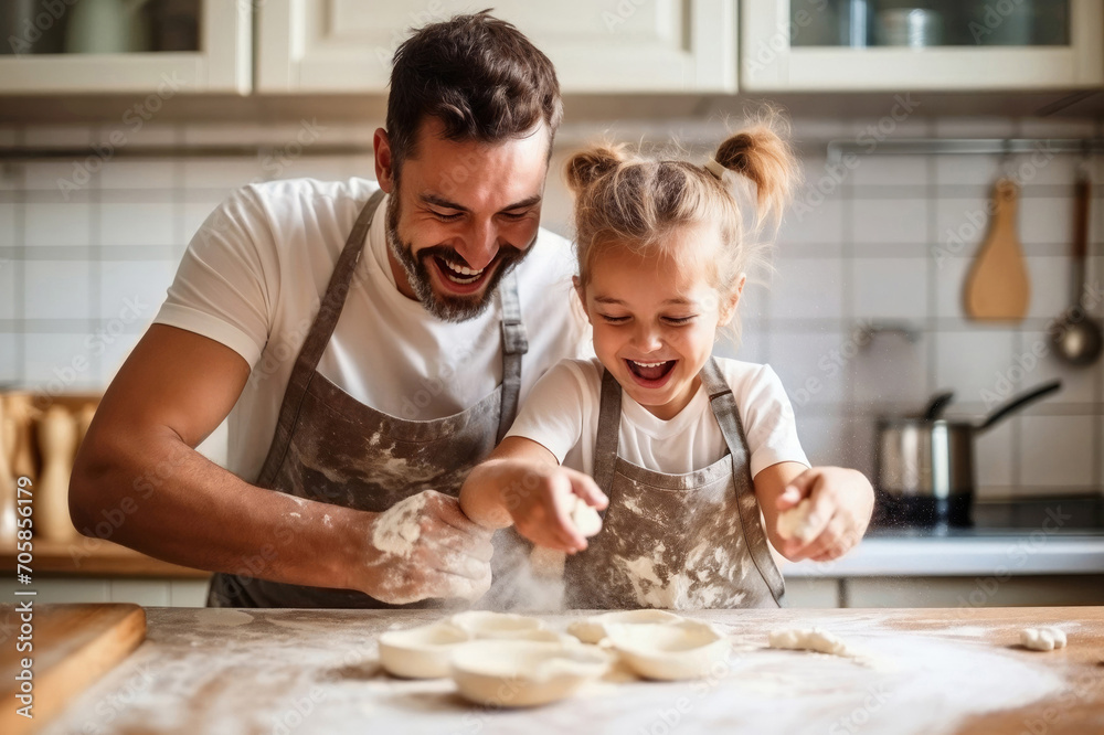 Happy father and daughter sharing a moment of joy in the family kitchen, preparing dough with flour, cooking together with complicity #705856179