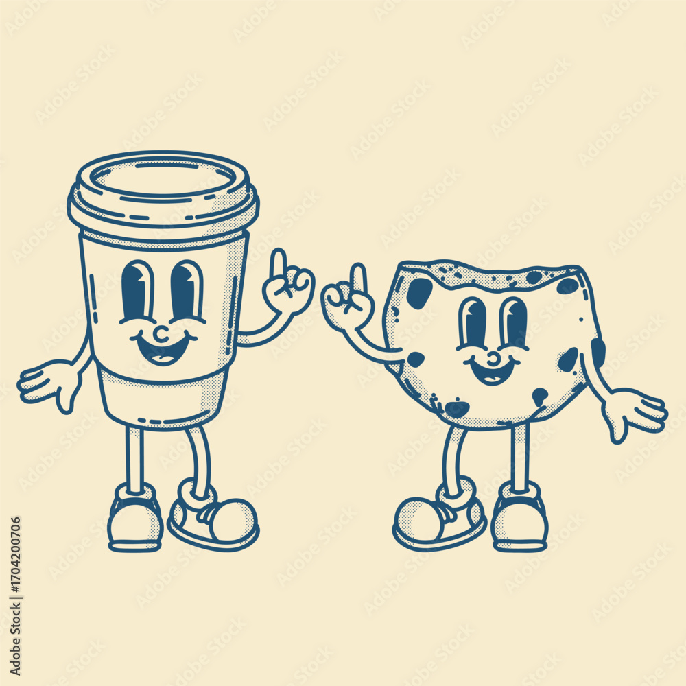 Happy retro mascot cookie and coffee to go character, smiling, thumb up gesture. Menu, homemade bakery symbol #1704200706