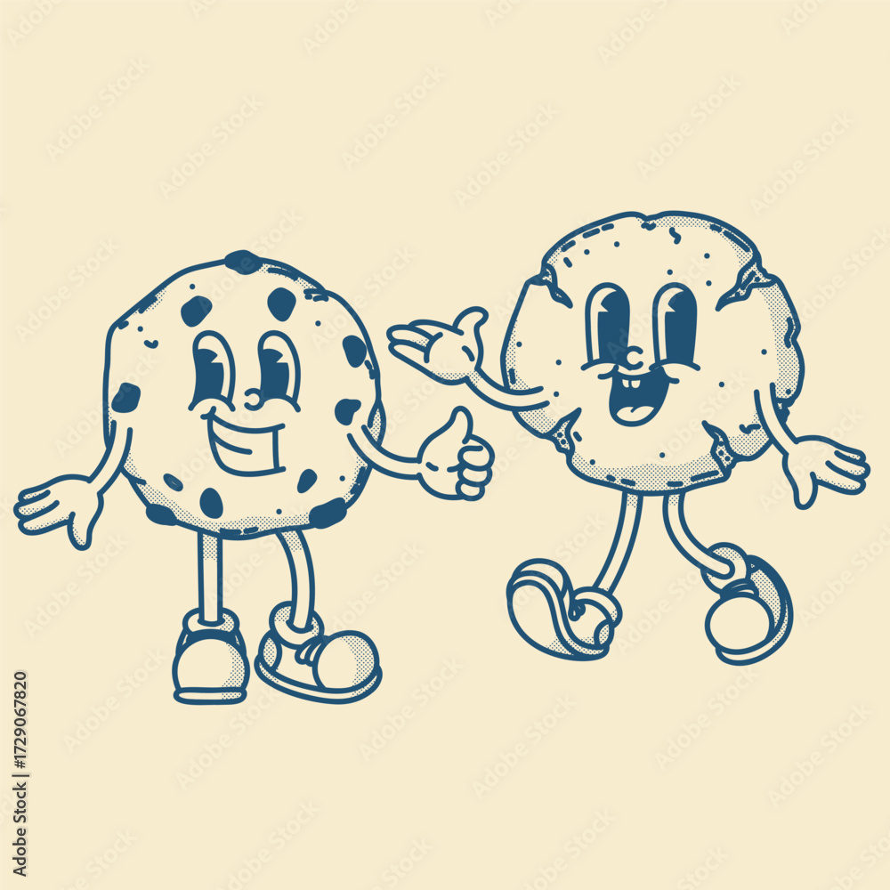 Happy retro mascot cookie character, smiling, finger up and thumb up. Menu, homemade bakery symbol #1729067820