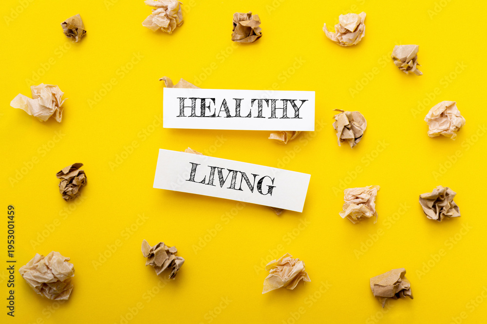 Healthy living concept with crumpled paper surrounding bold text on vibrant yellow background, symbolizing wellness and lifestyle choices for improved health and vitality #1953001459