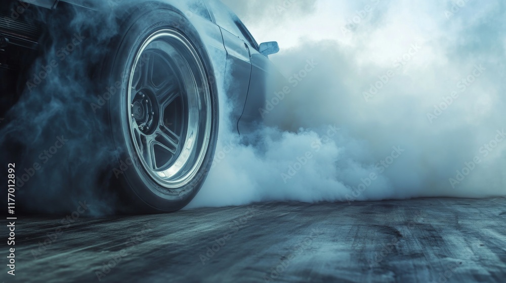 High-performance vehicle executes a powerful drift, generating thick smoke from its rear tires on a racetrack. The scene captures the intensity and excitement of motorsport #1177012892