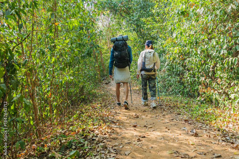 Hike walk through autumn forest, young couple enjoy natural travel, people carrying backpacks on mountain path, lush green natur surrounding adventurers #1847645712
