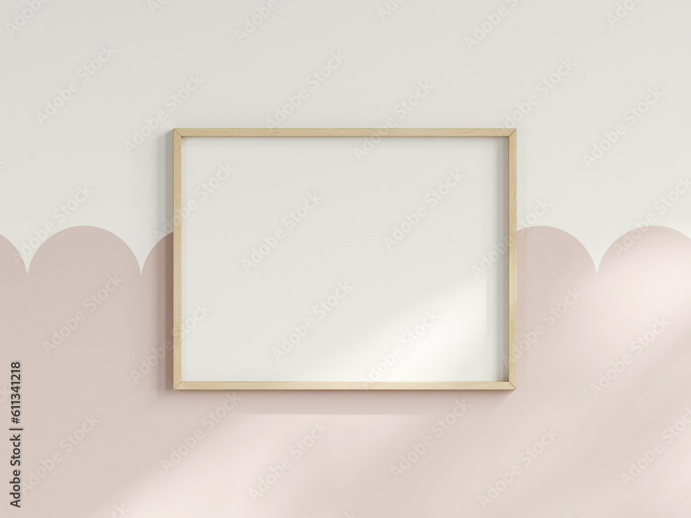 horizontal frame on the wall, girl room interior frame mockup, print mockup, baby room mockup, kids room mockup, nursery interior frame mockup, gallery wall mockup, pink wall mockup, 3d render #611341218
