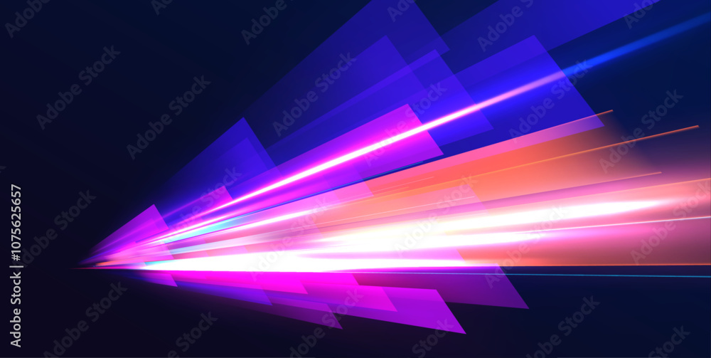 Horizontal night road in the form of a panorama with neon lights. Neon stripes in the form of drill, turns and swirl. Car motion trails. Speed line motion vector background. #1075625657