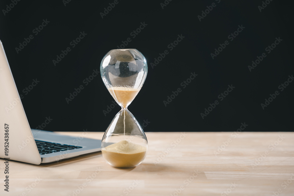 Hourglass, time glass, hour, sand clock, timer visualize business growth concept, urgency for deadline countdown, laptop rests on wooden desk to optimize business progress #1952438657