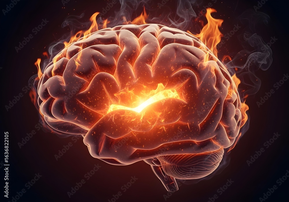 Human brain with glowing fire inside and smoke symbolizing stress burnout neurological inflammation #1636822105