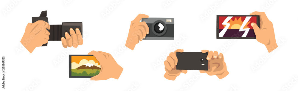 Human Hand with Camera and Smartphone Shooting and Filming Vector Set #1258347523