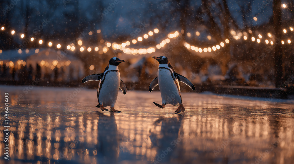 Ice Skating Penguins skate on an illuminated ice rink surrounded by festive lights, creating a cozy winter wonderland ambiance in the evening. Image made using Generative AI. #1786471400
