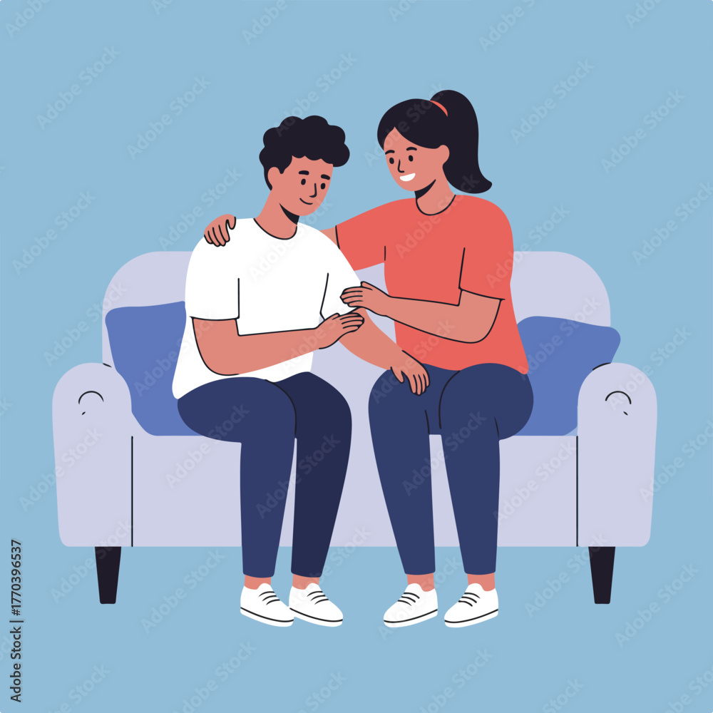 Illustration depicts two people on a sofa, one comforting the other with hands placed on arms and shoulders #1770396537