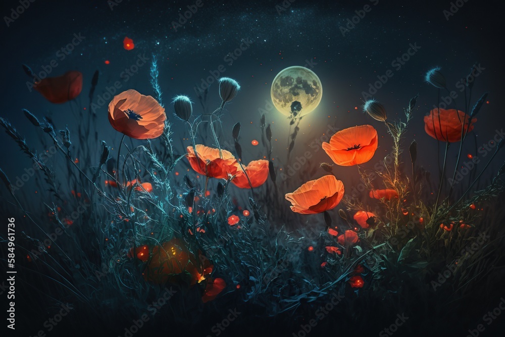 Illustration of poppy plants in the moon lit night sky, moon glow, serene night #584961736