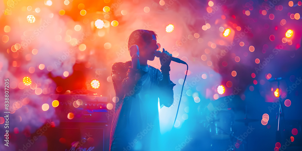 Imagen de un hombre delgado cantando en un concierto frente a miles de personas dando un espectáculo con luces y humo #838807205