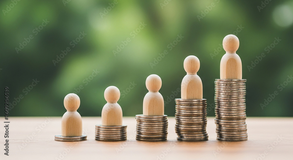 income inequality salary distribution, wooden figures standing on uneven coin stacks representing wage gap employee hierarchy and financial disparity concept#1609206539