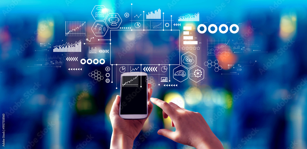 Industry 4.0 theme with person using a smartphone at night #1937558160