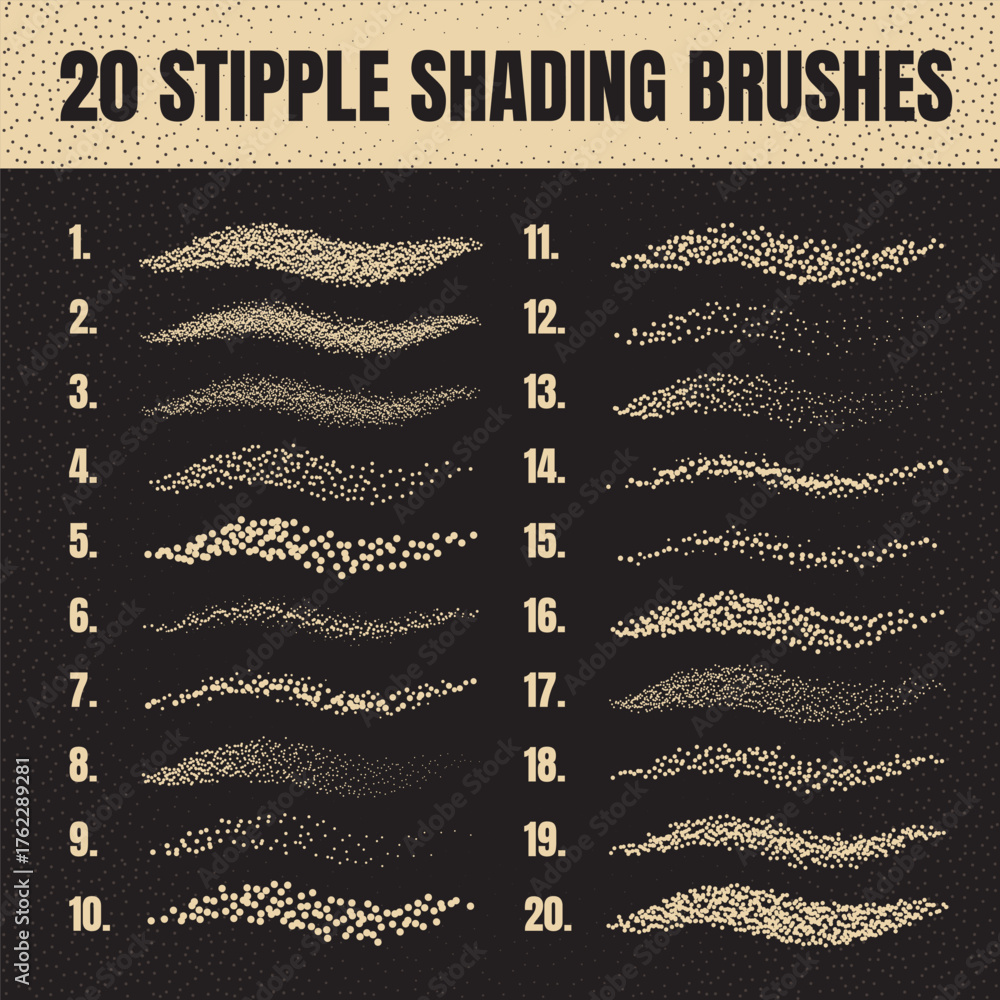Ink scatter brush, stipple drawing and texturing. Fading gradient. Stippling, dotwork drawing, shading using dots. Halftone disintegration effect. White noise grainy texture. Vector illustration #1762289281