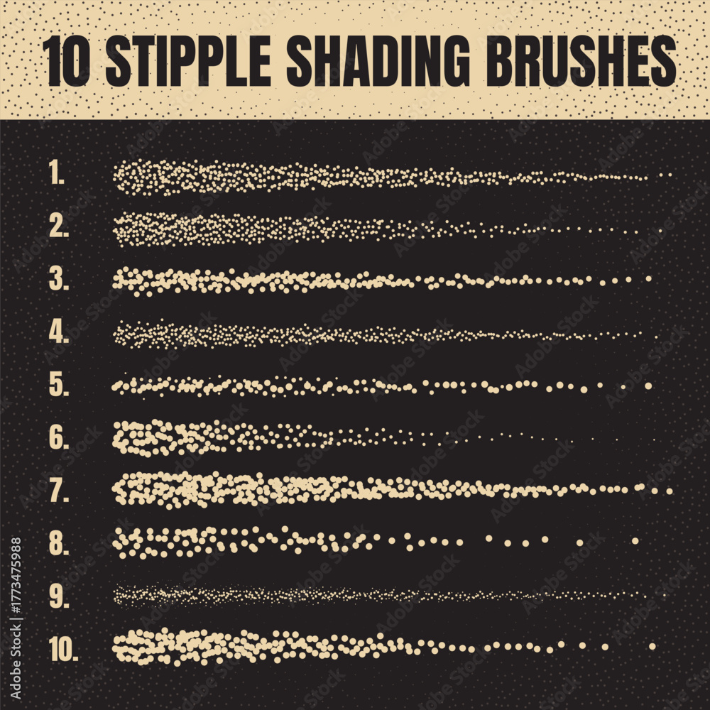 Ink scatter brush, stipple drawing and texturing. Fading gradient. Stippling, dotwork drawing, shading using dots. Halftone disintegration effect. White noise grainy texture. Vector illustration #1773475988