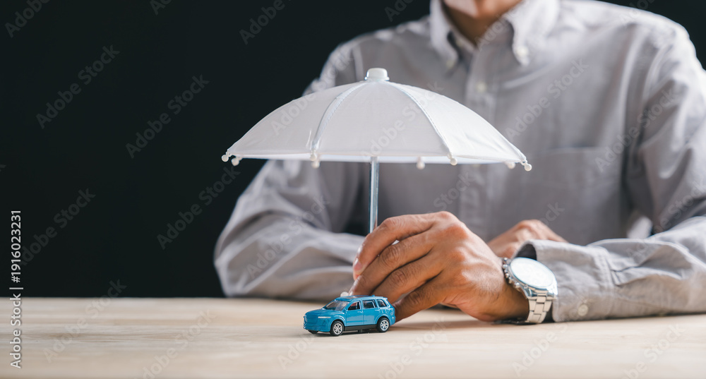 Insurance concept highlights vehicle protection, hand holds small umbrella shielding blue auto from accident risk, driver buys policy for security and future finance management plan #1916023231