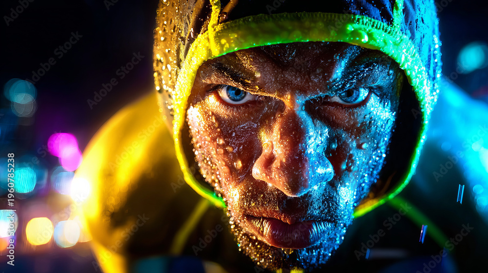Intense Athlete Face with Sweat and Neon Light at Night #1960785238
