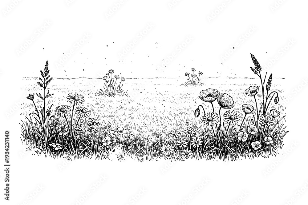 Intricate black and white wildflower field with poppies and daisies #1934231140