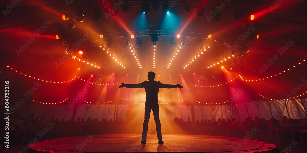 Сircus. Dramatic rear view of a magician on stage with arms wide open, surrounded by spotlight beams and atmospheric smoke in a vintage theater. #804753216