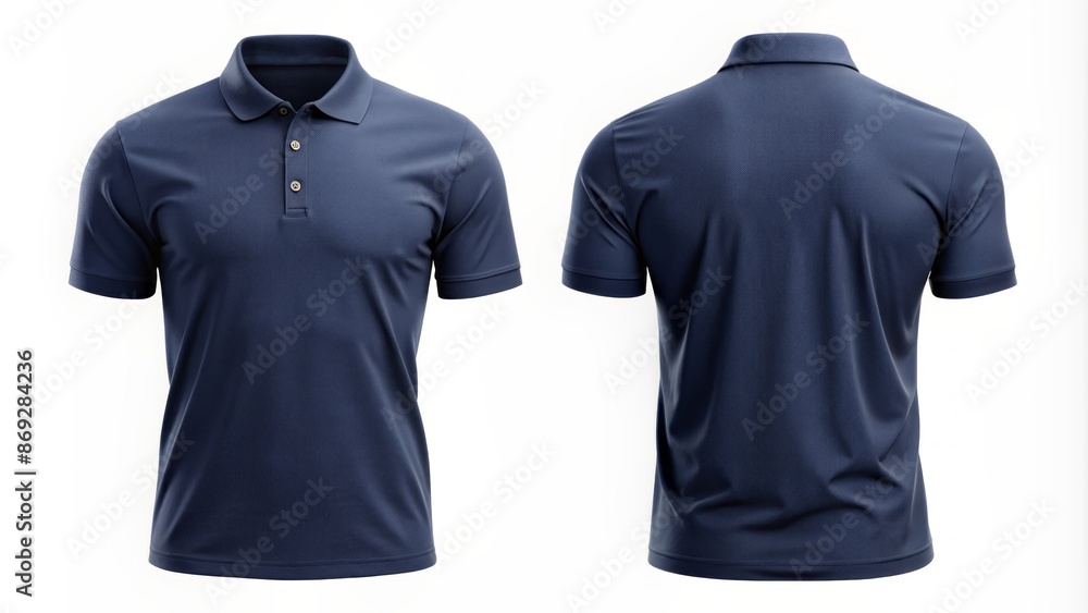 Isolated blank navy blue polo shirt mockup template on white background for customizable design and print presentation purposes. #869284236