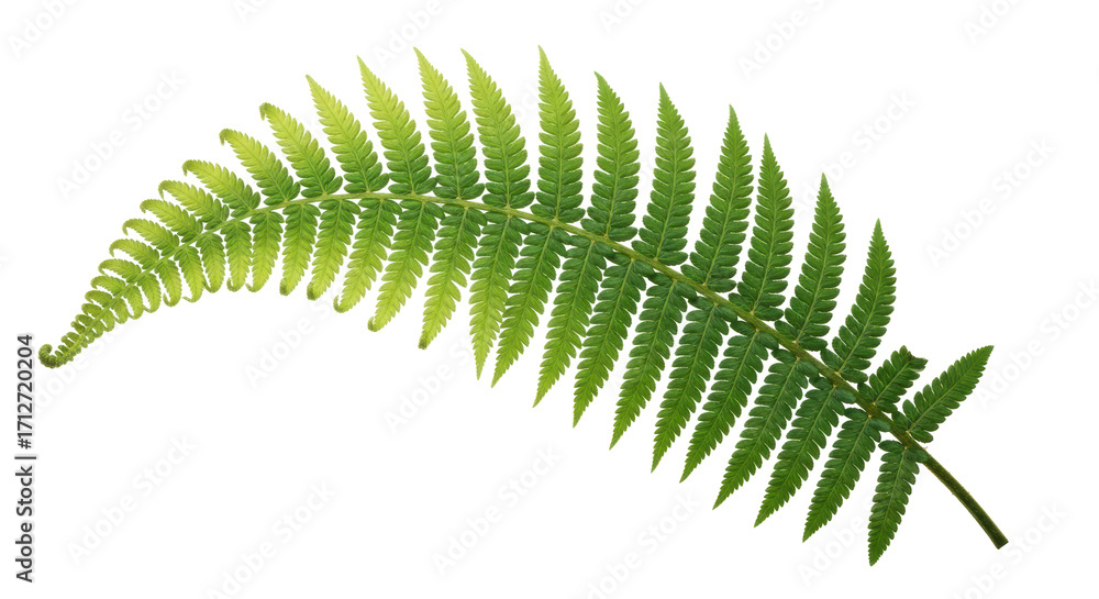 Isolated fern frond with textured, bright green pinnules against a simple background #1712720204