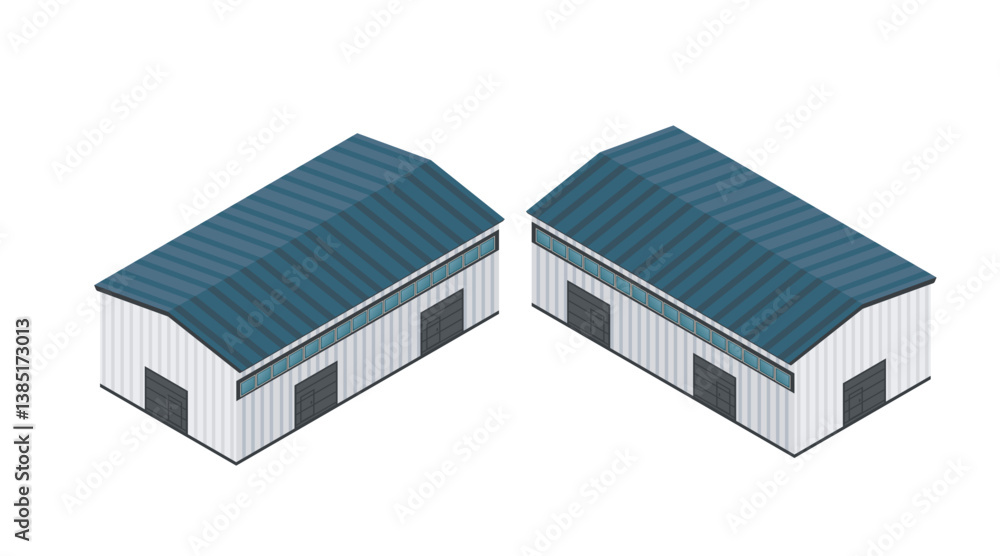 Isometric set of white industrial buildings. Warehouse structures. Factory facilities. Metal and concrete industrial constructions. Commercial storage buildings. Vector illustration isolated on white #1385173013