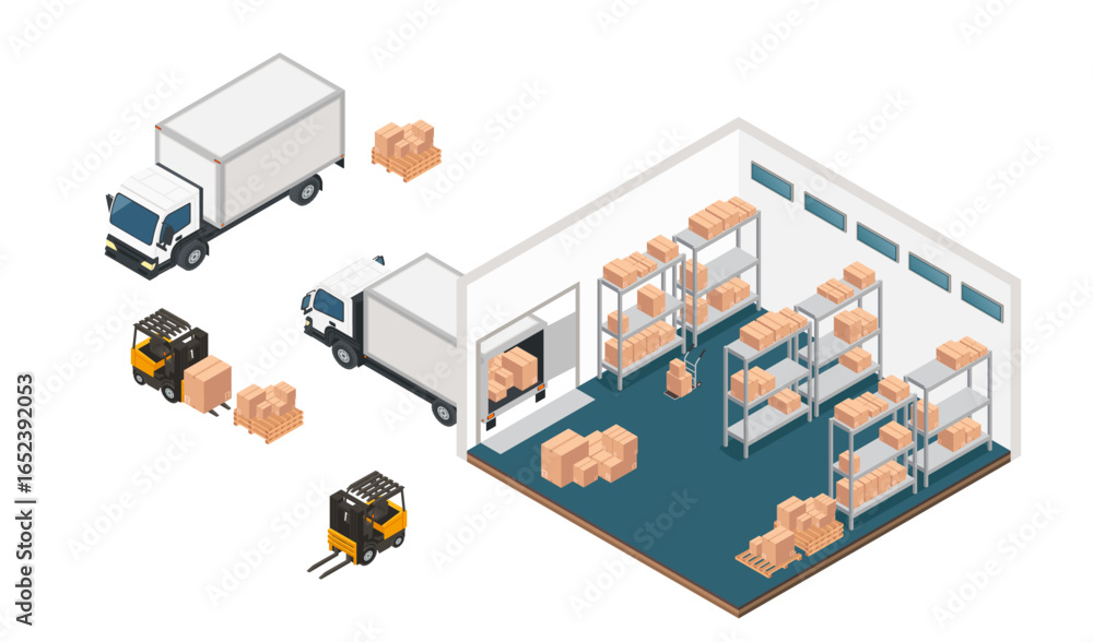 Isometric warehouse logistics. Storage facility with shelving units, delivery trucks, forklifts and cargo boxes. Blue floor organized inventory system. Modern distribution center. Vector illustration #1652392053