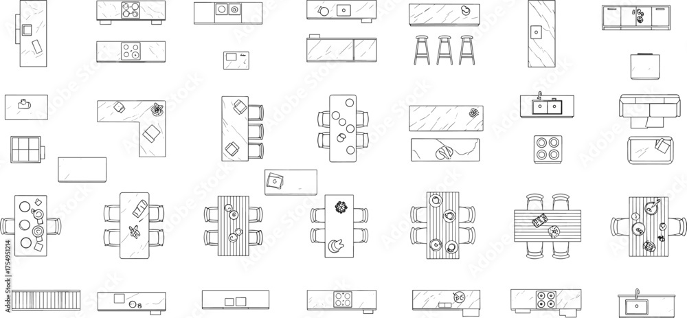 Kitchen layout symbols, top view furniture, interior design icons, CAD drawing, vector illustration, countertop setup, appliance plan, dining zone, bar stools, schematic grid #1754951214