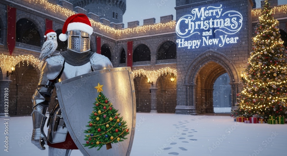 Knight Celebrating Christmas at the Castle - A knight in shining armor with a Christmas hat stands in front of a castle with a Christmas tree and decorations. #1812237810