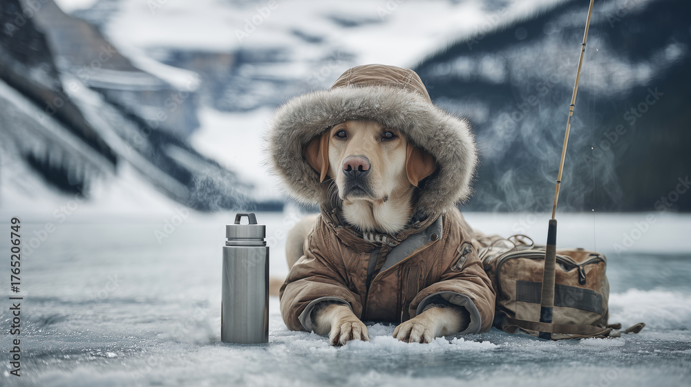 Labrador Retriever Dressed in Winter Coat Ice Fishing on a Snowy Frozen Lake with Gear and Thermos. Image made using Generative AI. #1765206749