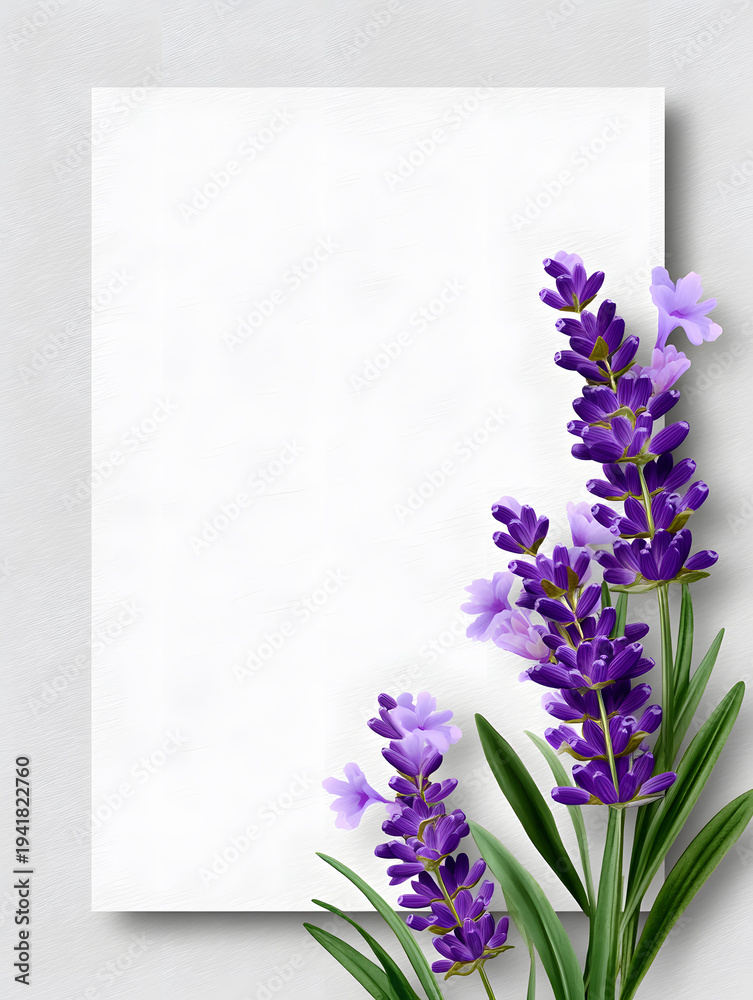 Lavender flowers with blank card mockup isolated on light background representing floral stationery design. #1941822760
