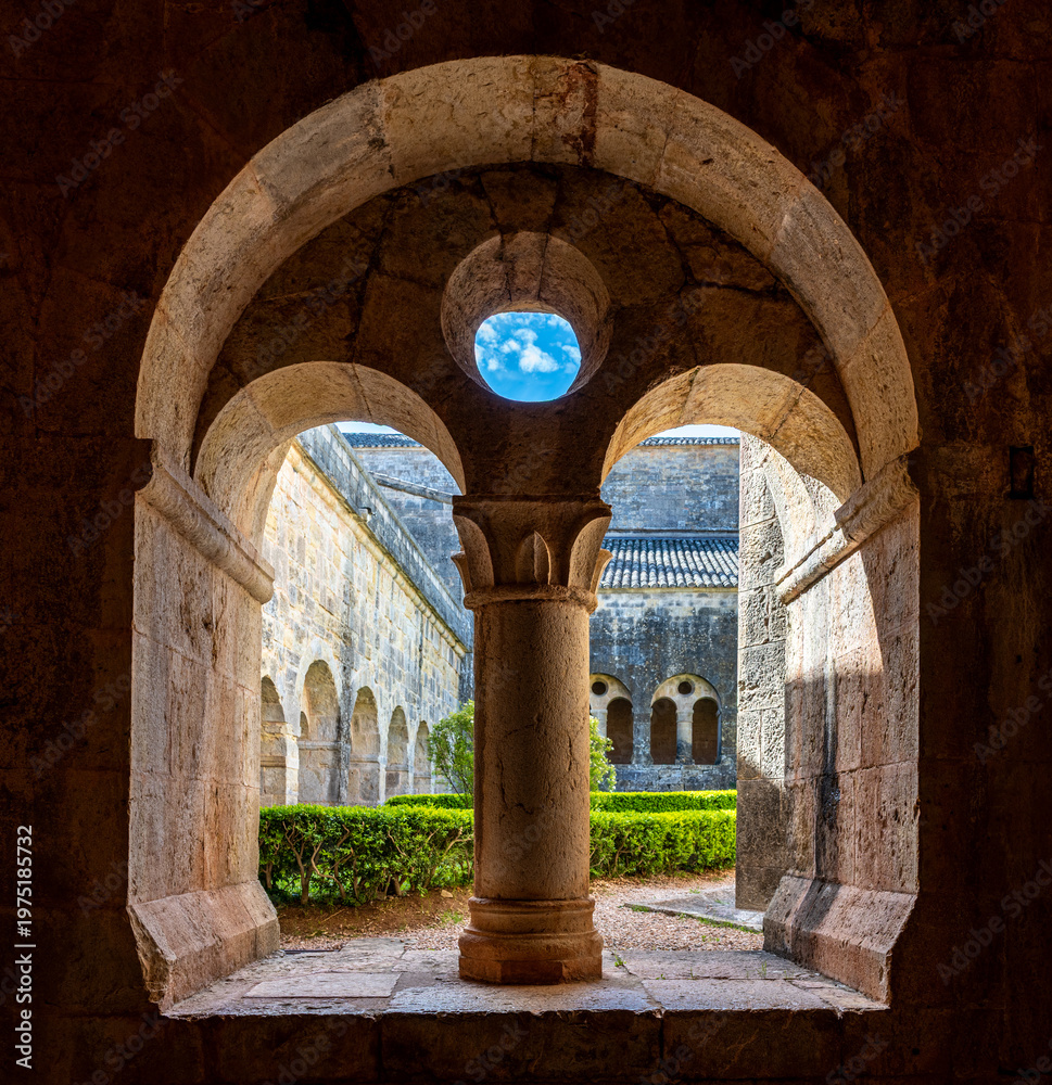Le Thoronet Abbey cloister view, Provence-Alpes-Côte d’Azur, France : Romanesque arches framing courtyard with central column and blue sky #1975185732