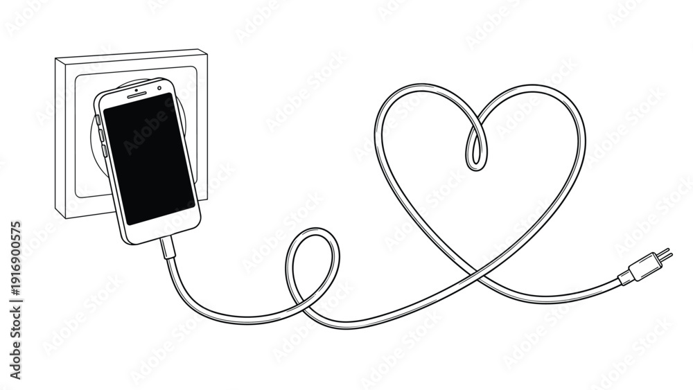 Line art illustration shows a smartphone plugged into a wall outlet with the charging cable looped into a romantic heart shape. #1916900575