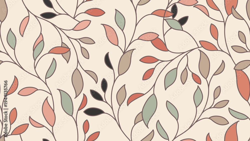 Line Art Leaves Seamless Pattern. Cute Leaf Print with Colorful Curvy Leaves Branches. Floral Template Design for Textiles, Fabric, Clothing, Wallpaper, Banner, Modern Home Decoration, Background #1944135766