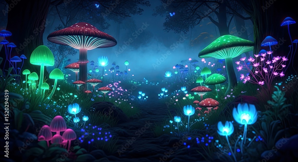 Luminous Glowing Mushrooms Trail Through A Dark Forest Scene With Colorful Light Display #1520294519