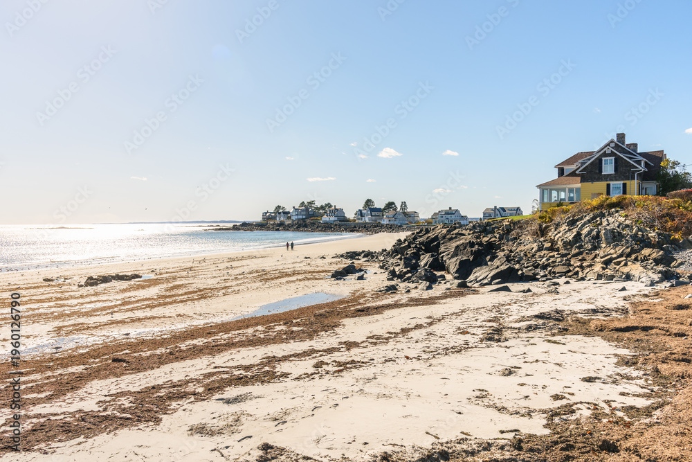 Luxury houses along a sandy beach in Maine on a sunny autumn day. A couple are walking along the shore. #1960126790