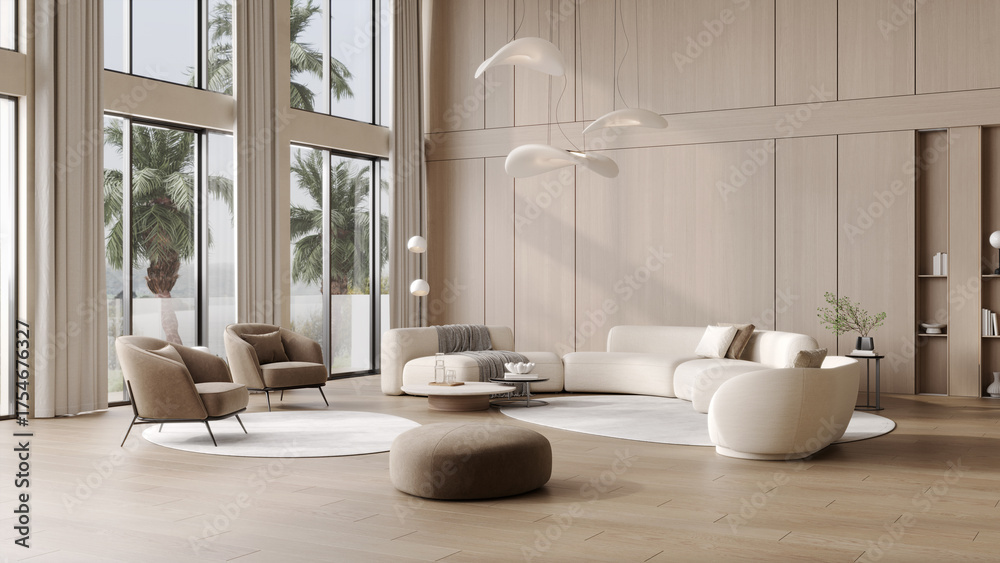 Luxury modern villa interior with wooden walls, soft white sofas, designer lamps, panoramic windows and elegant minimalist decor, 3d rendering #1754676327