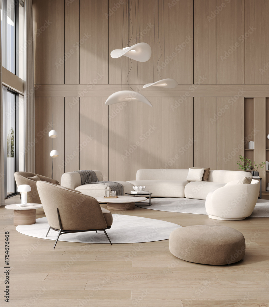 Luxury modern villa interior with wooden walls, soft white sofas, designer lamps, panoramic windows and elegant minimalist decor, 3d rendering #1754676468