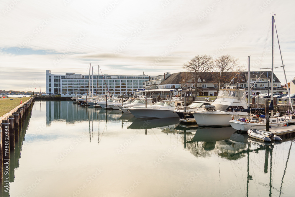 Luxury yachts in a harbour under partly cloudy sky on fall morning. Reflection in water. #1960127338