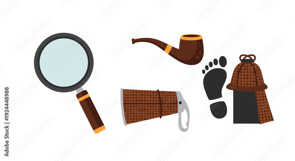 Magnifying glass, brown tobacco pipe, deerstalker hat, boot print, and a brown striped bugle are presented as detective items. #1924448988