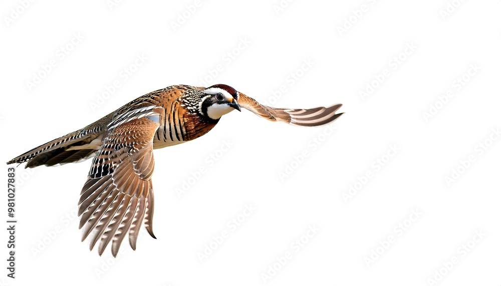 male northern bobwhite quail - Colinus virginianus - flying in flight with wings open and extended isolated cutout on white background with copy space #981027883