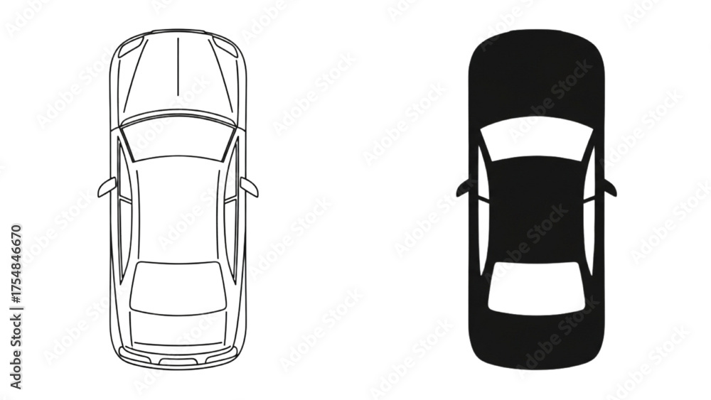 Minimalist graphic top view car icons showcasing outline and solid silhouette illustrations for transportation design #1754846670