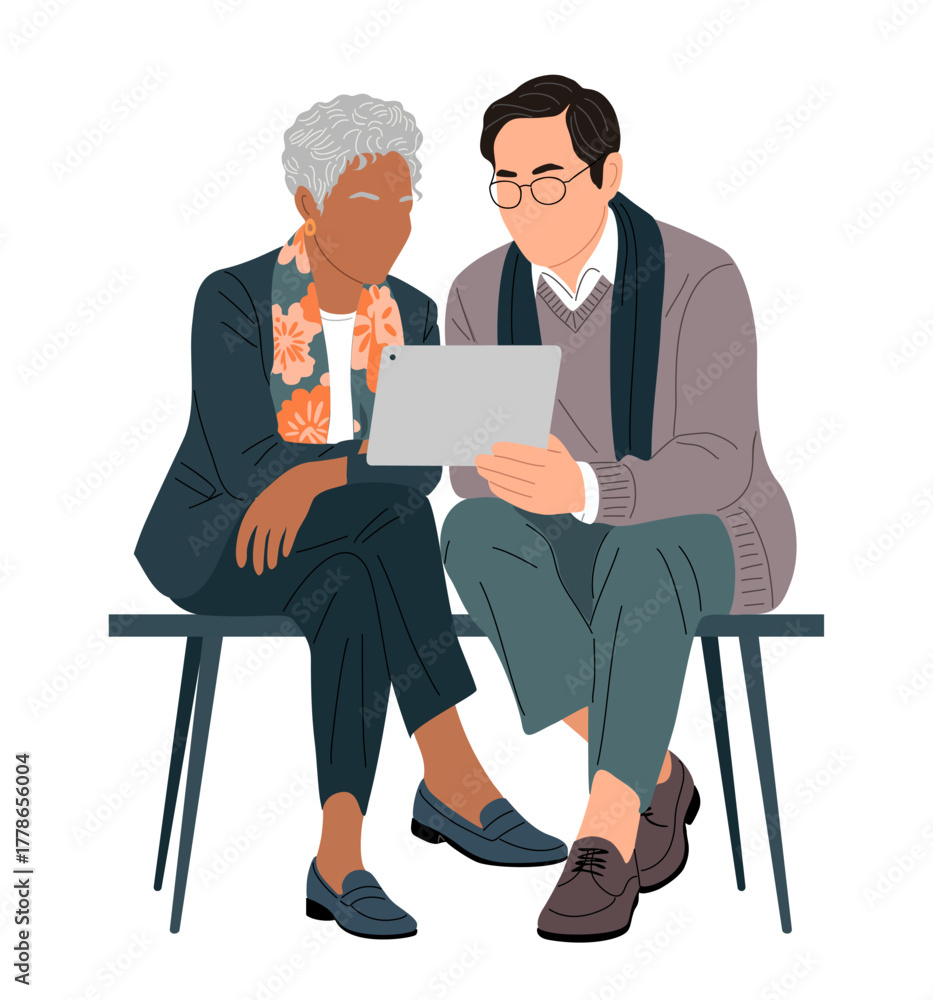 Minimalist vector illustration of diverse business couple sitting on a dark blue bench, viewing a tablet together. Modern flat design with warm, collaborative professional atmosphere #1778656004